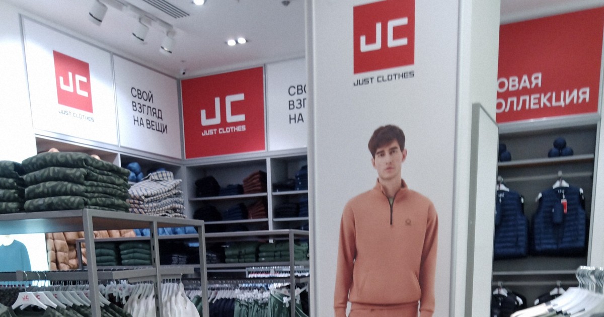 ロシアのカジュアル衣料品店「Just Clothes」は赤字に白抜きのロゴを使用。日本の「ユニクロ」を連想させる=モスクワで2023年9月24日、大前仁撮影.