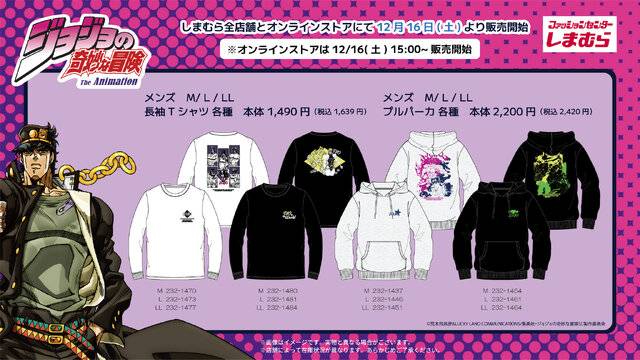 アニメ『ジョジョの奇妙な冒険 スターダストクルセイダース』の長袖Tシャツやプルパーカなどのアパレルがしまむら店舗とオンラインストアで2023年12月16日に…