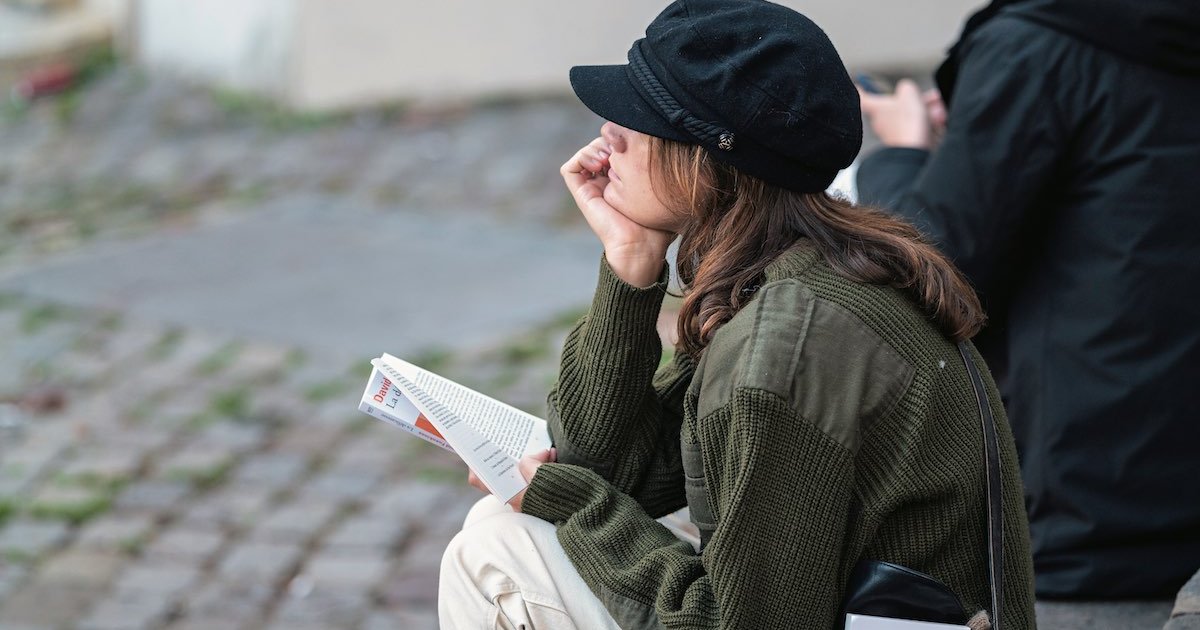 バッグに本を詰め込んで訪れる、彼女のお気に入りの場所。 トップス、キャップ/ともにVintage、パンツ/UNIQLO、ブーツ/UGG. Photograph: Taisuke Yoshida.