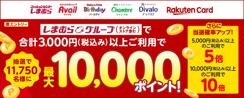 期間中、オンラインストアを含む「しまむら」や「アベイル」「バースデイ」「シャンブル」「ディバロ」のしまむらグループの店舗で楽天カードを3000円以上(税込…